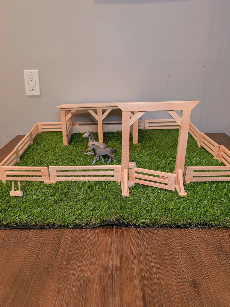 Let your imagination run wild with this model horse paddock that includes a stable and a gate as well as Schleich mother and baby horses. Fence is flexible and can be moved to create differently shaped paddocks. Artificial turf underneath simulates the grass of the pasture. Includes an extra fence connector. Artificial turf measures 29.5" by 30".